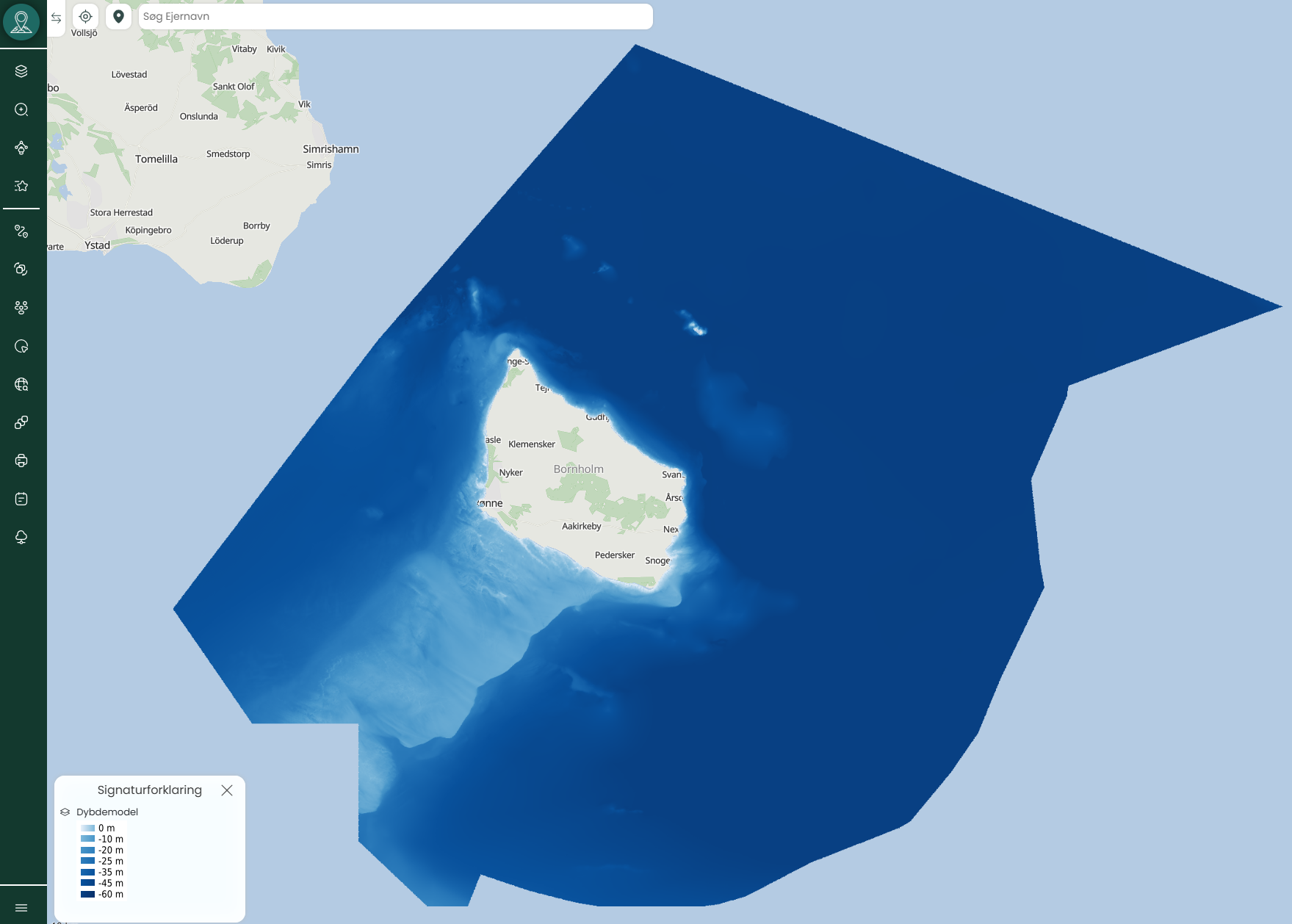 Danmarks Dybdemodel er et detaljeret kortlag, der visualiserer havdybden i de danske farvande. Kortlaget er baseret på nationale dybdedata og viser, hvor dybt havet er i forskellige områder omkring Danmark. Farvetonerne i kortet repræsenterer dybdeintervaller, og i signaturforklaringen fremgår det, hvilke farver der svarer til hvilke dybder – målt i meter. Laget dækker både kystnære og dybere marine områder, og er et uundværligt værktøj til analyser, der involverer maritim infrastruktur, kystnær biodiversitet, planlægning og klimatilpasning.