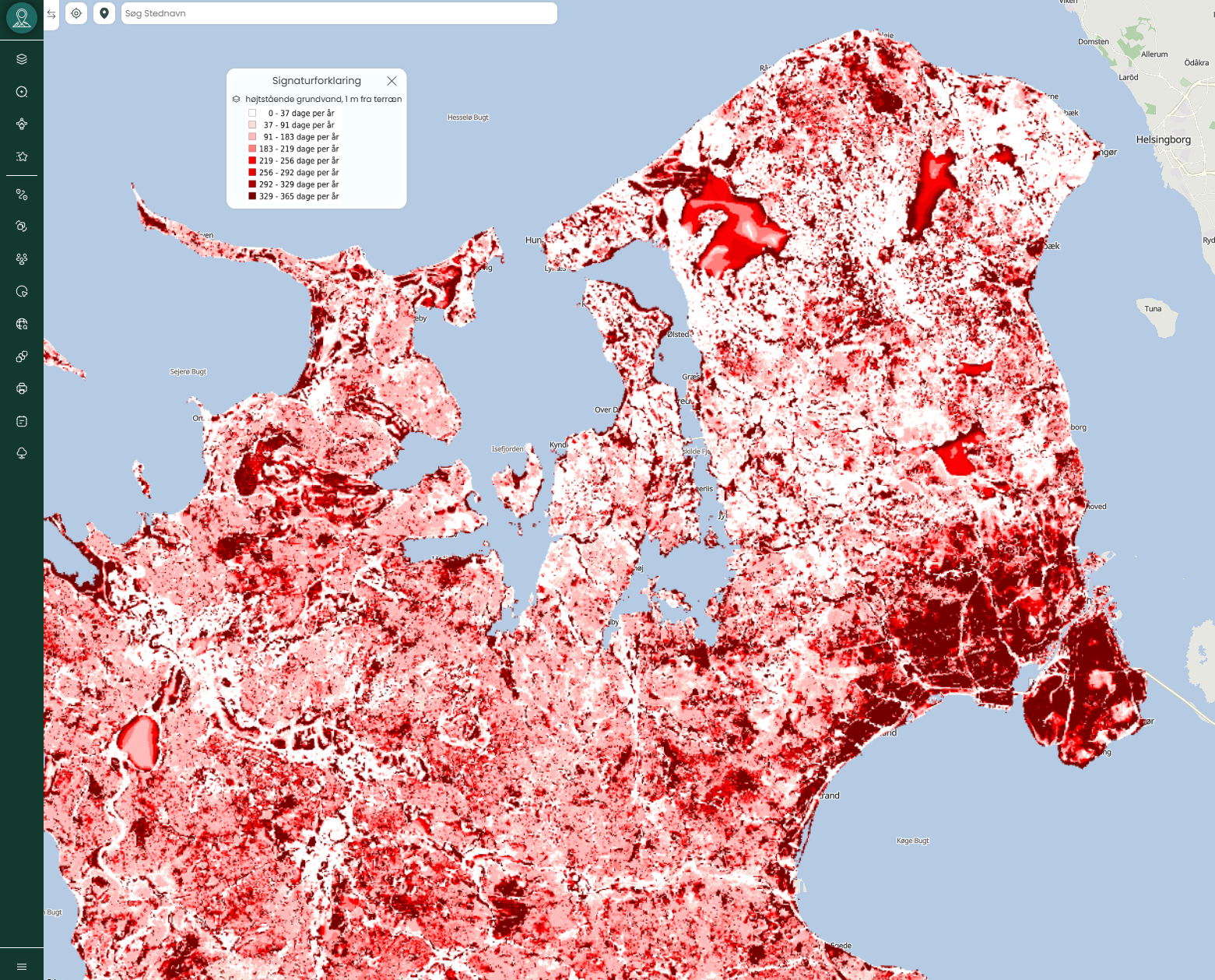 Det betyder, at grundvandsspejlet står mindre end 1 meter under jordoverfladen. Kortlaget viser antallet af dage pr. år, hvor dette er tilfældet – og er baseret på modeldata fra en 21-årig periode.