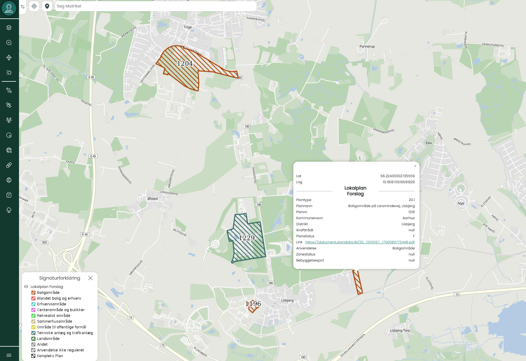 I Mapit kan du fx se lokalplanforslag nr. 1229 for et boligområde ved Larsmindevej i Lisbjerg (Aarhus Kommune). Klik på området i kortet og få adgang til metadata og PDF-link til selve lokalplanforslaget direkte fra Plandata.dk.