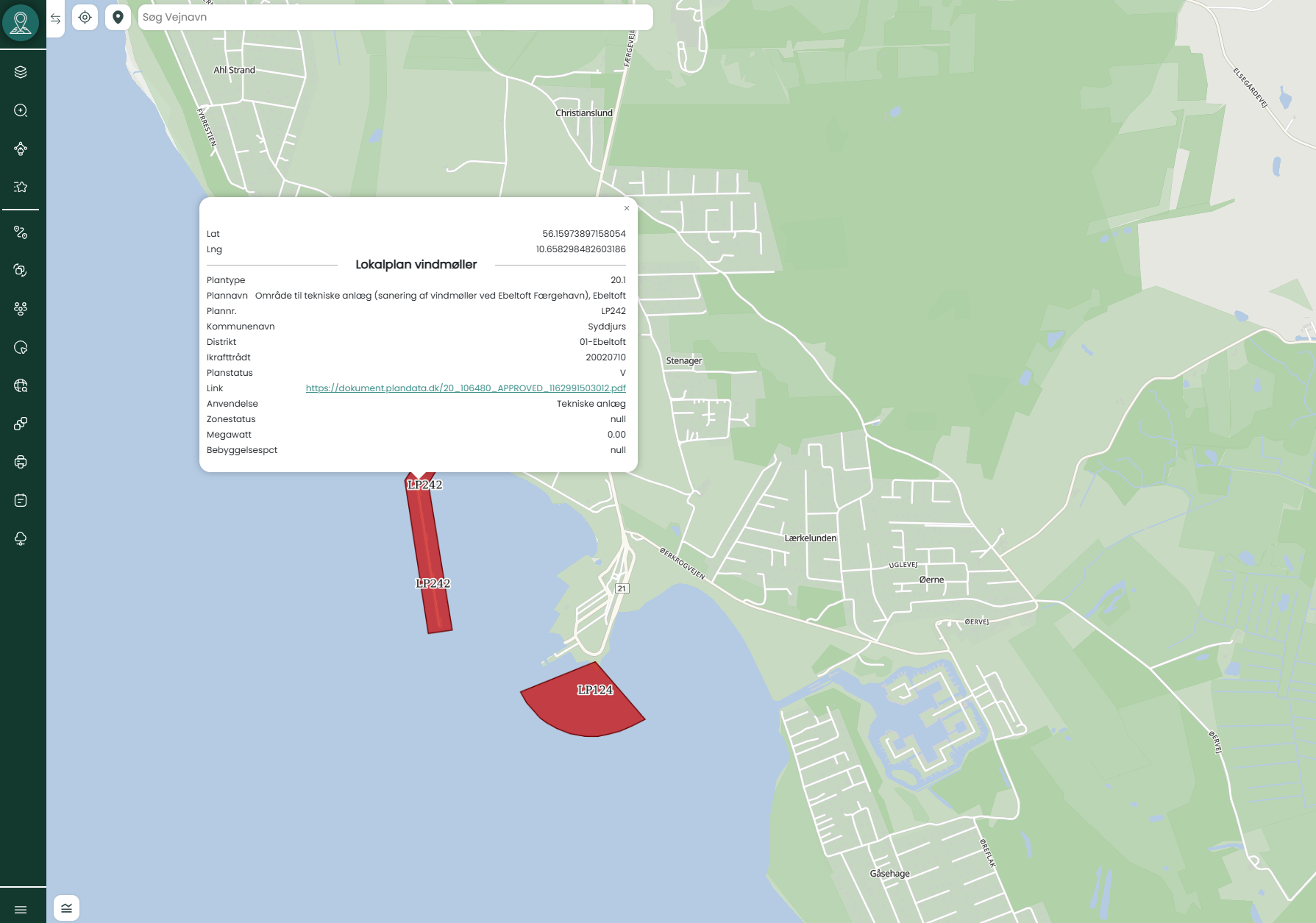 Eksempelvis ovenfor viser lokalplan LP242 i Ebeltoft en sanering af eksisterende vindmøller nær færgehavnen. Via kortlaget får du adgang til både overblik og detaljeret planinformation direkte i Mapit.