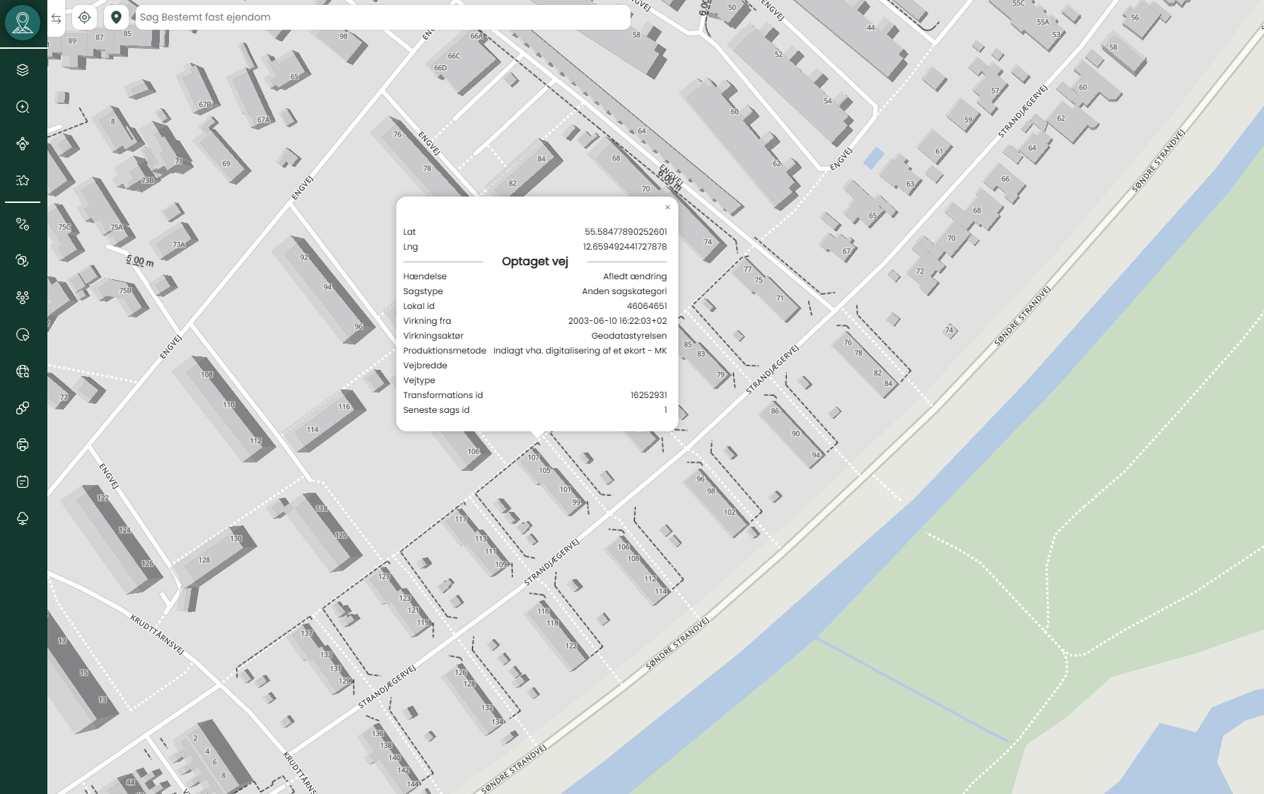 Du kan bruge kortlaget Optaget vej i Mapit-platformen til at identificere optagne vejarealer. Når du klikker på en vej i kortet, vises detaljer som sagstype, virkningsdato, vejtype og oplysninger om dataregistrering.