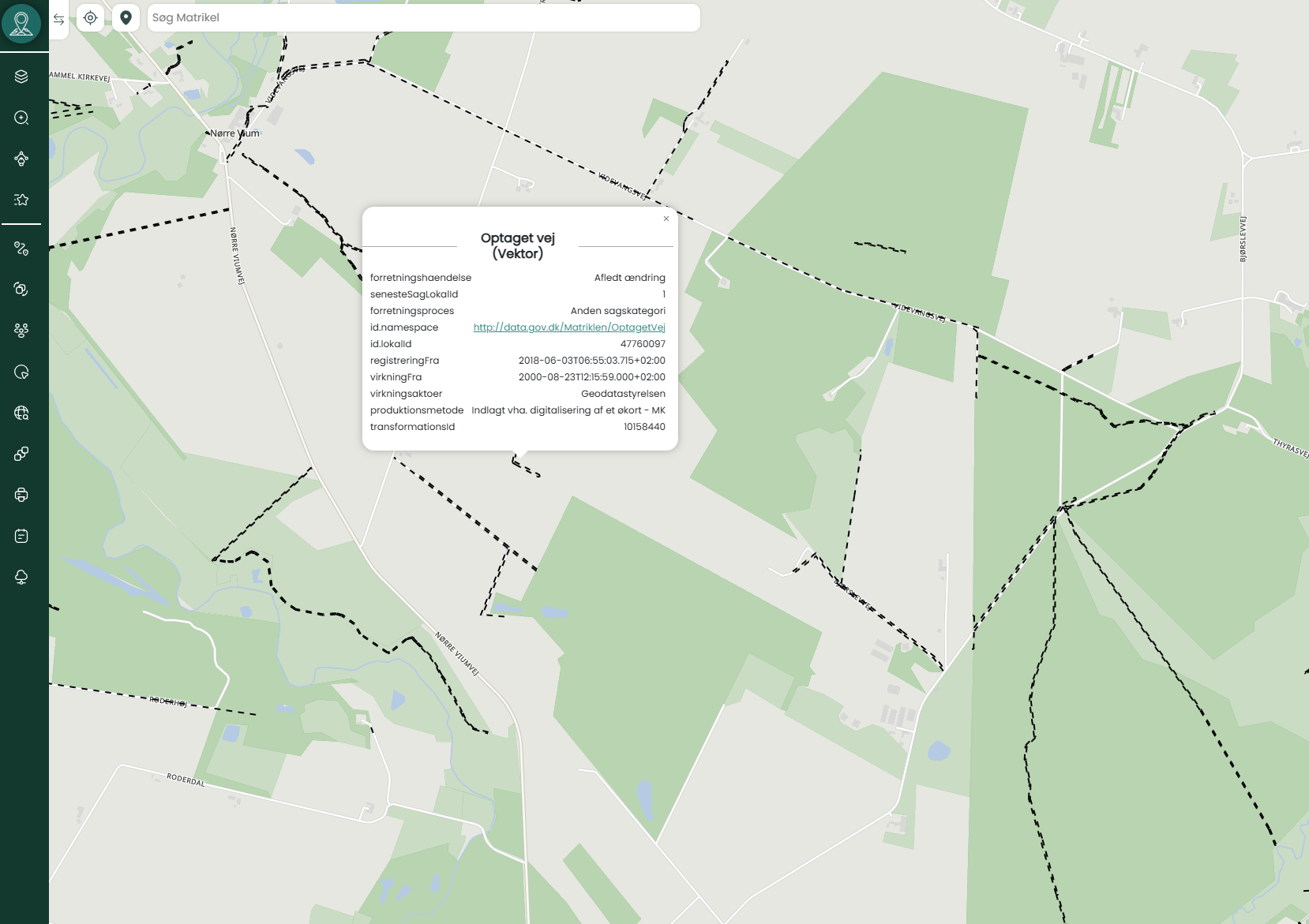 Kortlaget “Optaget vej – Vektor” viser offentligt optagne veje i Danmark, som er registreret i det danske matrikelregister. Vektordelen, som er indlæst via digitalisering af matrikelkort, viser vejens præcise geografiske forløb og status som optaget vej.